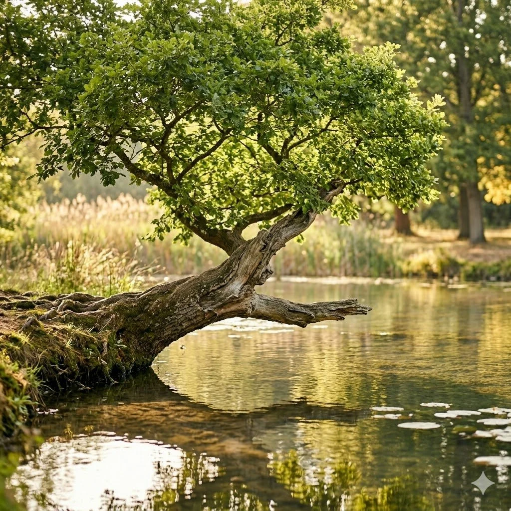 There is a tree along a riverbank near my home that I have walked past more times than I can count. It does not grow straight up. It grows almost entirely horizontal — reaching out over the water at an angle that looks, at first glance, like something went wrong. Like it fell and never quite recovered. Like it is one bad storm away from ending up in the river entirely.